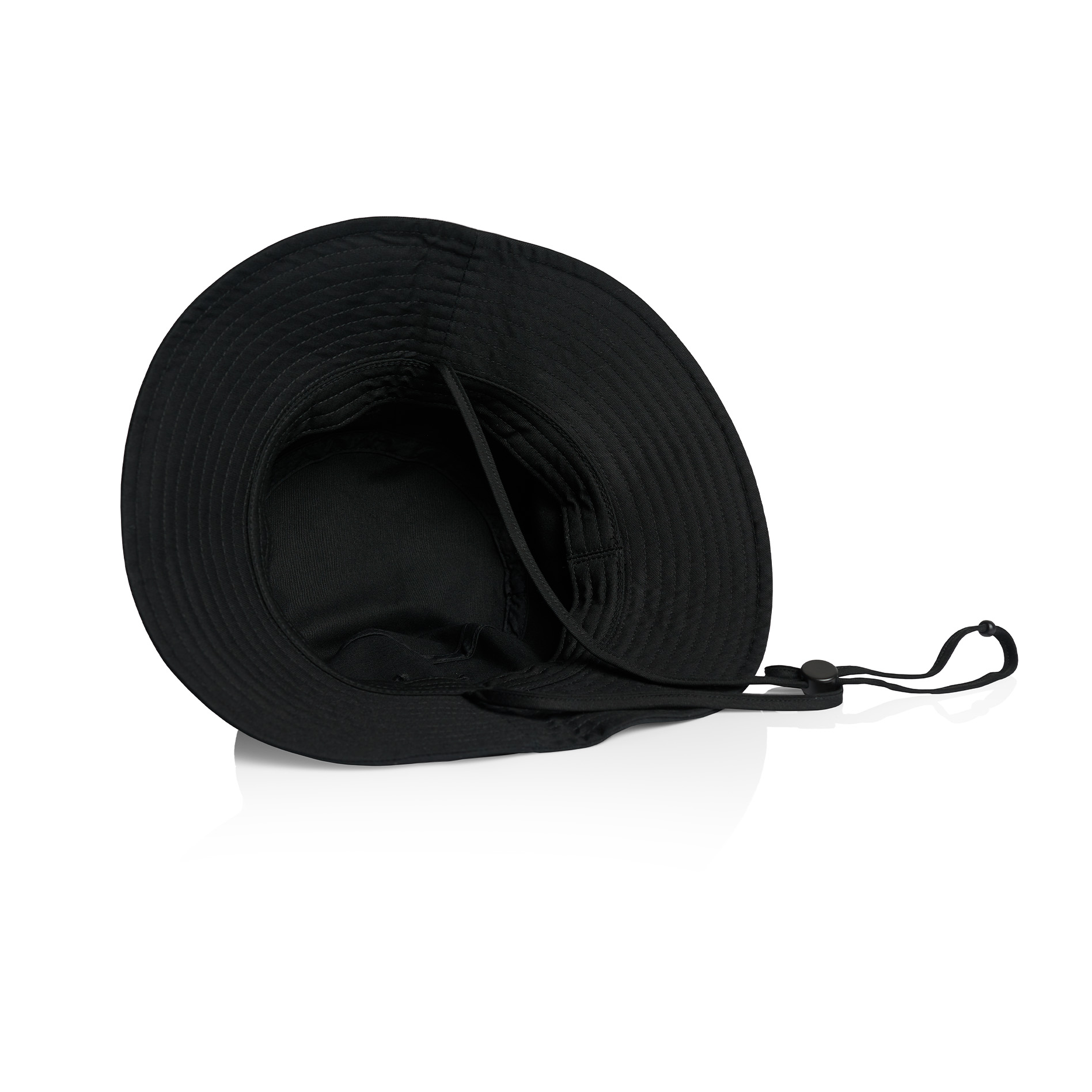 Reinforced large brim with stitching detail, side eyelets, self-fabric chin strap, plastic adjustable toggle.